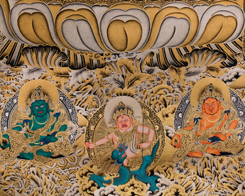 The lotus base beneath Avalokiteshvara is beautifully adorned with representations of Amitayus and Namgyalma, further enhancing the artwork’s spiritual significance. At the bottom of the piece, the wealth deities Dzambhala, in their various forms (Red, Green, White, Yellow, and Black), bless the viewer with prosperity, abundance, and protection.