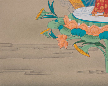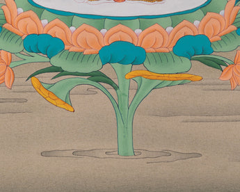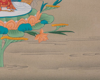 Each detail of the painting embodies rich religious symbolism. The Dharma wheel, crystal rosary, and granting mudra refer to the path of enlightenment. The bow and arrow, vase, and wish-fulfilling jewel held in his radiant hands represent offerings of spiritual awakening. The fully blossoming lotus behind him and the deerskin draped over his shoulder signifies spiritual power, compassion, and purity. Standing upon a lotus throne atop a moon disc, this artwork radiates divine presence, making it ideal for meditation, altar display, or as a thoughtful spiritual gift.