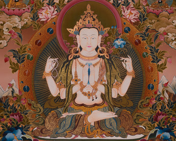 The Bodhisattva of Compassion, Chenrezig, is portrayed at the center of this Thangka, signifying compassion and love for all people. Below him, Manjushri, the Bodhisattva of Wisdom, wields a sword to cut through ignorance. At the same time, Vajrapani, the defender of the Buddha's teachings, is depicted in a fearsome form, signifying strength and protection. Together, they embody the essential elements of the spiritual journey: compassion, wisdom, and power. The five Dhyani Buddhas - Amitabha, Akshobhya, Ratnasambhava, Amoghasiddhi, and Vairocana - are depicted above Chenrezig, each seated on a lotus base. This thangka inspires practitioners to engage in more profound meditation, devotion, and realization by welcoming them into enlightenment.