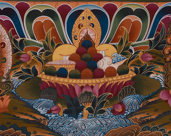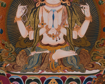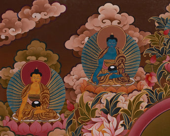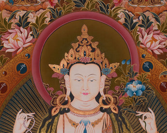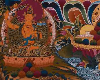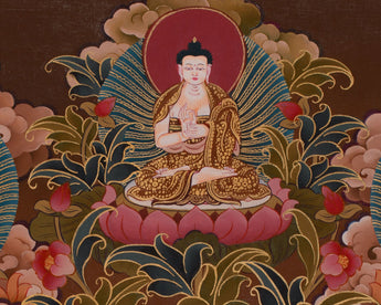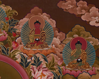 This Three Great Bodhisattvas Thangka depicts the revered Avalokiteshvara, the Bodhisattva of Compassion, flanked by Manjushri and Vajrapani. A talented artist has painstakingly hand-painted this Thangka in the traditional style, displaying amazing artistry and attention to detail. High-quality acrylic colors create vivid hues and detailed patterns, guaranteeing depth and vibrancy for a long time. The cotton canvas is a solid and lasting basis for this spiritual artwork, resulting in a timeless piece. Furthermore, significant components of the Thangka are accentuated with genuine 24K gold, which heightens its spiritual significance and lends a sense of sacred beauty.