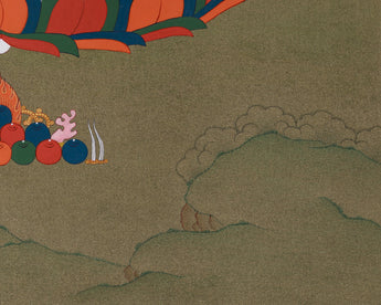 Chenrezig, the Four-Armed Bodhisattva of Compassion, is frequently depicted seated serenely with grace, holding a lotus and a crystal rosary, while softly demonstrating the mudra of infinite compassion. His calm expression and elegant posture inspire contemplation, and the lotus throne, combined with the celestial backdrop, emphasize his enlightened essence. As a key figure in Tibetan Buddhism, Chenrezig embodies the infinite compassion of all Buddhas, making this thangka a meaningful tool for daily practice, altar display, or meditative focus.