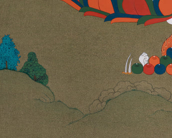 The Tibetan Bodhisattva Four-Armed Chenrezig Thangka is a carefully hand-painted spiritual artwork on fine cotton canvas, using rich acrylic colors and genuine 24K gold. Created in the elegant Karma Gadri style, it features the deity’s tranquil form with a spacious layout and luminous details. The gold highlights shine on his crown, jewels, and aura, giving the painting a divine glow that deepens its meditative quality. Using traditional materials and sacred techniques, this painting serves both as a visual masterpiece and a vessel of spiritual energy.