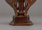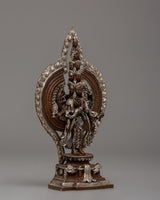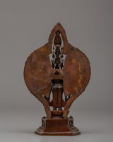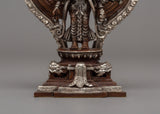 The statue's compact size and ornate design make it ideal for personal altars or sacred spaces, instilling a sense of peace, compassion, and serenity in its surroundings. The combination of oxidized copper and silver plating gives this statue an ancient yet timeless appearance, making it a desirable addition for both collectors and practitioners. This statue's exquisite craftsmanship, attention to detail, and rich symbolism make it an invaluable representation of Chenrezig's boundless love and compassion.