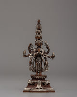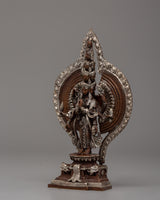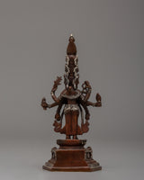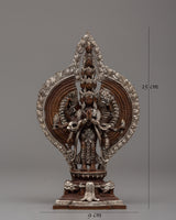 This 1000 Armed Chenrezig artwork of compassion and mercy, is expertly crafted from oxidized copper and silver-plated materials. Standing 15 cm tall and 9 cm wide, the statue depicts the deity in a highly detailed and intricate design. The deity is standing gracefully, with multiple arms extending outward in various positions, representing Chenrezig's vast compassion for all sentient beings.