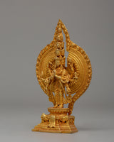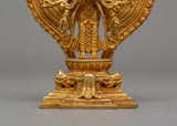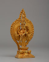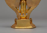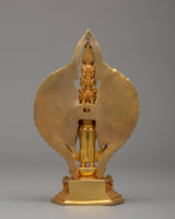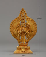 This 1000 Armed Chenrezig statue, intended for use in shrines or sacred spaces, is a beautifully crafted piece made of copper with a gold finish. This stunning representation of the Bodhisattva of Compassion, measuring 15 cm tall and 9 cm wide, has intricate and elaborate details. The gold polish improves the visual appeal, making it a standout focal point. The deity's multiple arms extend outward in a perfectly arranged pattern, representing Chenrezig's compassion for all sentient beings around the world.