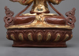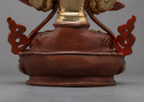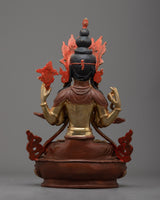 Behold the mesmerizing beauty of this 4-armed Chenrezig Statue, lovingly handcrafted on a copper body and adorned with a resplendent 24k gold gilded finish. Standing in all his compassion and grace, the deity is depicted in the classic pose, seated upon a lotus base, radiating boundless love and compassion to all beings. The intricate details are further enhanced by delicate acrylic painting, bringing this divine figure to life with vibrant colors and subtle nuances.