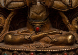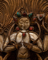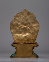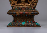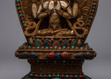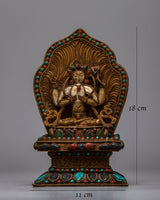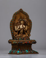 Elevate your spiritual practice with our amazing 4-Arms Chenrezig Buddha Statue, meticulously crafted to represent compassion and wisdom. This figure, formed of copper and generously electro-gold-plated, conveys divine presence and grace. The monument is adorned with a unique conch shell, representing purity and appealing to awaken beings from their ignorance. Each detail is embellished with precisely inlaid artificial turquoise, coral, and lapis lazuli stones, evoking spiritual meaning and beauty.