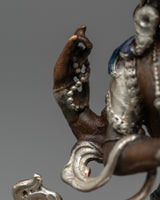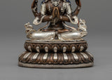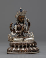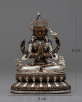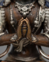 Embrace the peace and splendor of Tibetan Buddhism by holding the statue of Avalokiteshvara Chenrezig Bodhisattva. This machine-made statue has been meticulously crafted to ensure authenticity and longevity on an oxidized copper body. The delicate features of this spiritual masterpiece are enhanced by the brilliant touch of electro-silver plating.