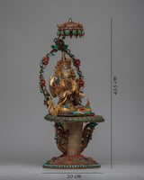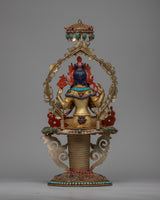 The statue's 24k gold-plated part is made of copper and adds an opulent touch to its design while representing the deity's richness and heavenly favors. The Chenrezig Statue, positioned elegantly atop a lotus base, epitomizes kindness and unwavering love.