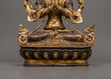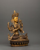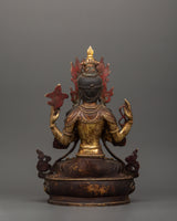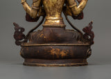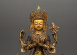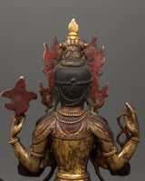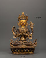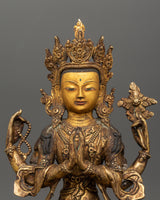 Handcrafted Bodhisattva figurines represent compassion and enlightenment in Tibetan Buddhism. This gorgeous antique-finish copper statue, measuring 32.5cm in height and 22cm in breadth, depicts Chenrezig, the Bodhisattva of Infinite Compassion, who is respected for guiding creatures to enlightenment. This spiritual item, with his four arms representing the Four Immeasurables (Loving-Kindness, Compassion, Joy, and Equanimity), is an essential addition to meditation rooms, altars, and Buddhist shrines.