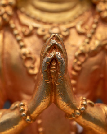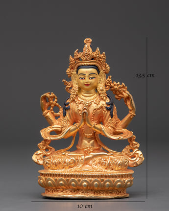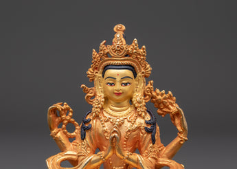 This Chenrezig Compassion Deity Statue is expertly crafted with a copper body and electro-gold plating, radiating a divine aura of compassion and wisdom. Representing the Bodhisattva of Compassion, this statue serves as a powerful symbol to inspire kindness, empathy, and spiritual awakening in your life.