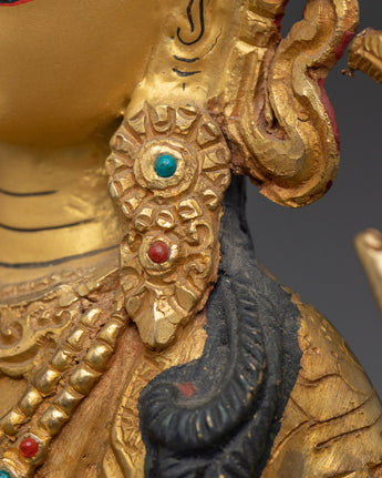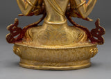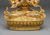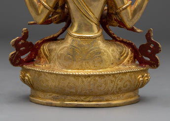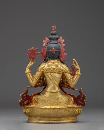 This Handmade Copper Chenrezig Statue beautifully captures the essence of compassion and loving-kindness. Measuring 8.7” (22 cm) in height and 6.3” (16 cm) in width, and weighing 1.47 kg, it is crafted from a copper body and richly adorned with 24K gold gilding, detailed gold and acrylic paintings, and carefully inlaid gemstones. This piece reflects exquisite Nepali artisan craftsmanship. Its harmonious proportions and vibrant finish make it an inspiring addition to any altar, meditation space, or personal collection, offering both spiritual significance and artistic elegance.