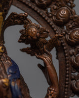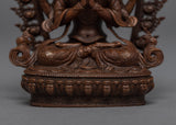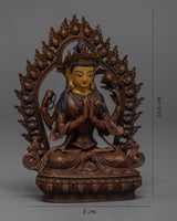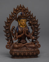 We have artistically crafted this miniature statue of Chenrezig Sadhana Sculpture, which has a body created using oxidized copper and a face gilded with 24-karat gold. The deity is depicted seated cross-legged on a moon disc of a lotus with a serene look, clutching rosary beads and a full lotus in each of his rear arms. His front two arms are shown in a courteous namaste. This figure can be used in various Buddhist rituals and meditation exercises.