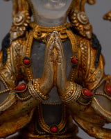 Crafted with meticulous attention to detail, this masterwork exemplifies creative mastery and spiritual commitment. The half-crystal, half-copper combination catches the eye and embodies Chenresig's loving presence in Tibetan Buddhism. Each element, from the sparkling crystal to the rich copper tones and the symbolic coral stone, promotes reflection and inner serenity.