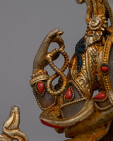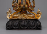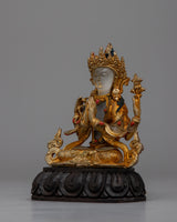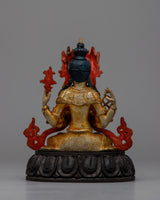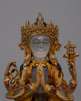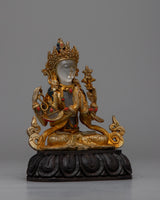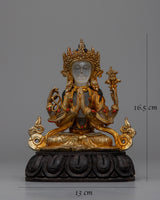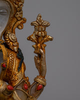 The Crystal Statue of Buddha Chenresig, a harmonic blend of crystal and copper, finely handmade and electro-gold plated, will transport you to peace. This magnificent statue rests smoothly on a wooden base, embellished with artificial coral stone inlays that add to its spiritual charm.