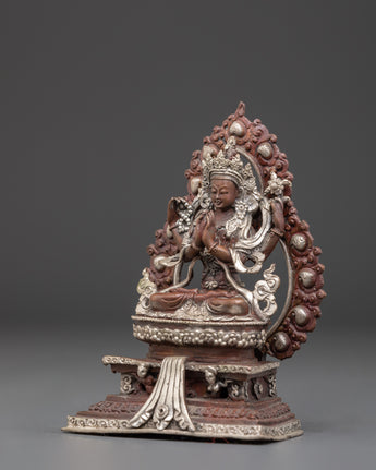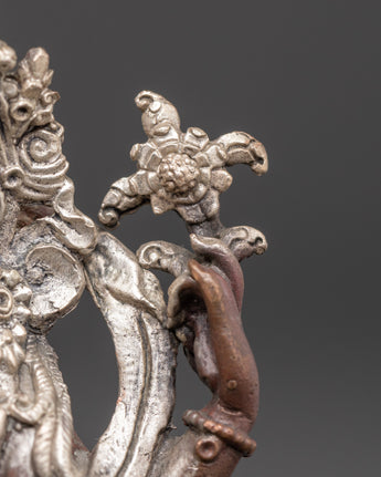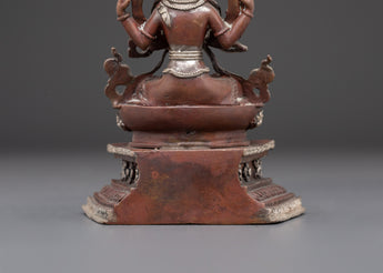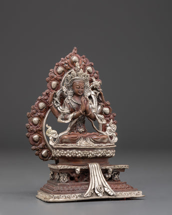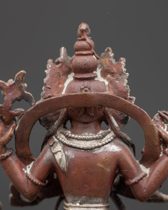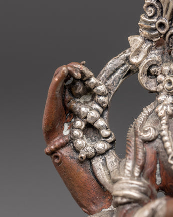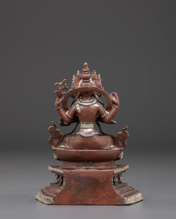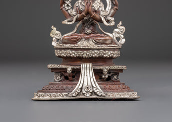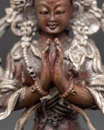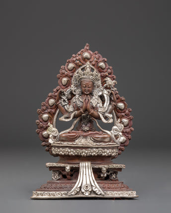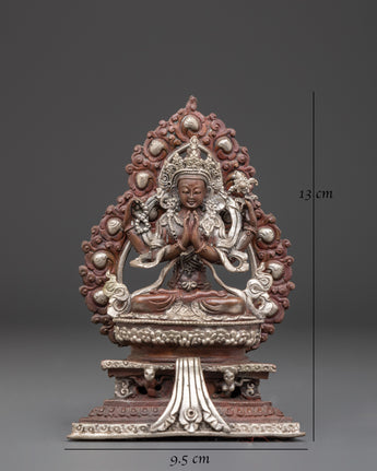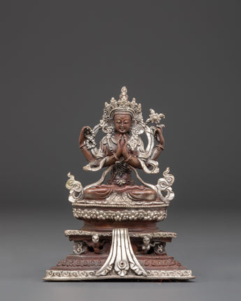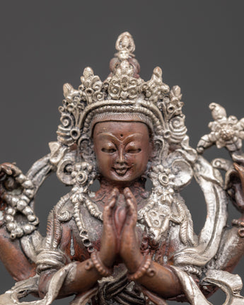 This sculpture of the Four-Armed Chenrezig is a beautiful depiction of the Bodhisattva of Compassion, Avalokiteshvara. This sculpture, which is 13 cm tall and made of oxidized copper, is silver-plated to bring out the fine details and exude a sense of heavenly kindness. Chenrezig's four arms represent the Bodhisattva's capacity to extend unending love, compassion, and protection to all living things. The symbolic items in each arm stand for compassion, wisdom, and the commitment to assist all sentient beings in achieving enlightenment.