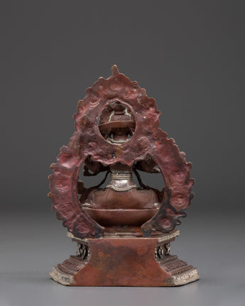 The figure's holy vitality is enhanced by its exquisitely oxidized copper body and silver-plated finish, and its elaborate pattern work showcases the distinctive cultural artistry of Tibetan handicraft. The serene, placid look of Chenrezig represents his function as a kind protector and mentor for individuals pursuing spiritual emancipation. This sculpture is not only a spiritual item but also a stunning collectible due to the intricate facial features, flowing robes, and exquisite crown, all of which demonstrate the high level of competence in Tibetan art.