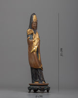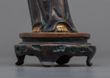 A Symbol of Divine Mercy in a Distinctive Asian Art Form "Guanyin Buddha" Our Guanyin Buddha statue, which was expertly handcrafted to represent profound spiritual meaning, is a symbol of mercy and compassion. It is a sizeable artwork measuring 12.2" tall by 3.5" wide and weighing a substantial 2.25 kg, signifying the importance of Guanyin in your spiritual path. The statue has an aged appearance since its body is made of oxidized copper. The use of gold plated and acrylic paintings highlight the deity's exquisite intricacies.