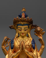 This magnificent Himalayan Chenrezig Statue represents Avalokiteshvara, the Bodhisattva of Compassion in Tibetan Buddhism. In Tibetan, he is known as Chenrezig, and he is regarded as embodying the Buddha's global compassion. This four-armed figure represents his all-encompassing compassionate behavior, which includes holding a lotus, prayer beads, and making a devotional motion with the primary hands in prayer mudra.