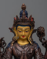 Introducing our Machine Made Four-Armed Chenresig Statue, a captivating representation of compassion, mercy, and limitless love. Crafted with painstaking attention to detail on an oxidized copper body, this statue oozes grace and spiritual resonance. Chenresig's tranquil expression is accentuated by the bright 24k gold electroplating on the face, which represents the deity's heavenly compassion and knowledge.