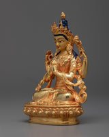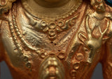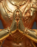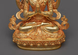 With our Miniature Chenrezig statue, you can experience unlimited compassion in its most charming form. Every aspect of this magnificent deity glows with amazing beauty thanks to the accuracy of machine molding. Chenrezig's holy aura is illuminated by a fundamental copper body covered with luxurious 24K gold gilding, while painstakingly placed acrylic paintings highlight his tranquil countenance.