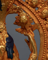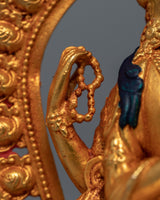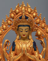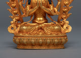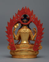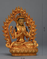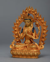 About Our StatueThe Miniature Chenrezig Sculpture was carved using a machine with a copper body and coated over the body with a layer of polished 24k genuine gold. The use of acrylic paint is done by hand, highlighting the sculpture's intricate design patterns. The Chenrezig is portrayed as seated upon a moon disc lotus in a meditative position with four arms and a peaceful gaze. The deity is decorated with numerous body ornaments and a crown illuminated by the nimbus cloud from behind the sculpture. This work of art will be the perfect gift from Nepal. The miniature form factor of the statue will be very suitable for traveling and carrying the statue all the time for your everyday meditational practices.
