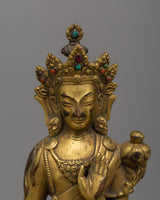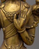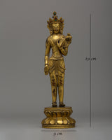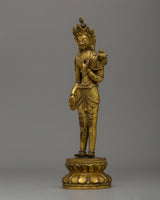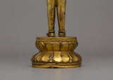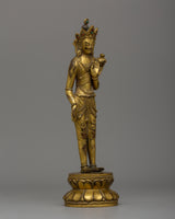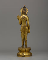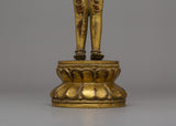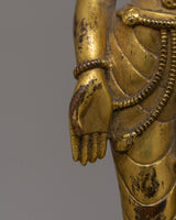 The visual representation of Lokeshwor is extremely important. He is represented in a standing position, signifying his active participation in alleviating pain. His right hand is uplifted in the Varada Mudra, which symbolizes charity, compassion, and the granting of boons. His left hand is in an Abhaya Mudra, symbolizing the promise to dispel the fears of sentient beings. The elaborate gold-gilded embellishments on his crown, jewelry, and attire radiate divine elegance and celestial beauty, while the precious stone inlays heighten his spiritual brilliance.