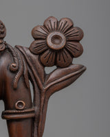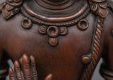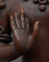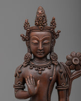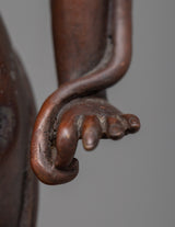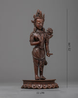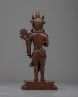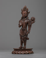 Look at the magnificent statue of Namo Avalokiteshvara, which stands 25 cm tall and proud. The divine presence of Avalokiteshvara, the personification of mercy and compassion, is brought to life in this exquisite work of art, which is carefully handcrafted on an oxidized copper body. The statue captivates everyone who sees it with every intricate detail, exuding awe and wonder. A touch of antiquity is added by the oxidized copper finish, which gives the statue a timeless mystique. Let this magnificent Avalokiteshvara statue serve as a glowing reminder to practice kindness and empathy in all facets of your life in your sacred space.