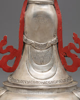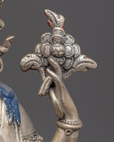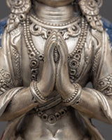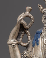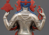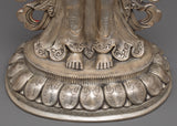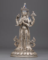 Chenresig, also known as Avalokiteshvara, is a prominent bodhisattva in Tibetan Buddhism who embodies compassion and mercy. This deity is depicted with a copper body that is silver-plated, standing upon a lotus base, and having four hands. Chenresig's two primary hands are pressed together in a gesture of prayer while the other two hold a mala (prayer beads) and a lotus flower. Chenresig is revered by Tibetan Buddhists as a powerful spiritual guide who helps alleviate suffering and cultivate inner peace.