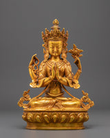 This incredible Tibetan Buddhist Chenrezig sculpture symbolizes the generous energy of Chenrezig, the Bodhisattva of Compassion. This sacred piece, handcrafted from copper and plated in gold, embodies centuries of Tibetan artistry and dedication. Its 33cm height, 24cm width, and 3.40kg weight make it a powerful yet calm presence, ideal for meditation rooms, personal altars, prayer places, or cultural collections. The sculpture depicts Avalokiteshvara's tranquil behavior, intricate robes, and symbolic iconography, making it a powerful emblem of love, knowledge, and protection. Chenrezig, a respected deity in Tibetan Buddhism, represents the Buddha's limitless compassion and bestows blessings and guidance to practitioners all over the world.