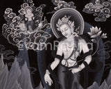 Experience the compassionate energy of Avalokiteshvara Bodhisattva of infinite compassion through this stunning digital Newari paubha painting print. With his arms and eyes, Avalokiteshvara embodies the qualities of compassion and skillful means. This artwork showcases the bodhisattva's serene expression, adorned with vibrant hues of black and white and intricate details that emphasize his divine beauty. As the embodiment of compassion, Avalokiteshvara serves as a beacon of hope and inspiration for those seeking relief from suffering. Hang this print in your meditation space or home to cultivate a sacred atmosphere and connect with the compassionate energy of Avalokiteshvara. Add this exceptional piece to your collection today and immerse yourself in the transformative power of the bodhisattva of infinite compassion.