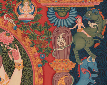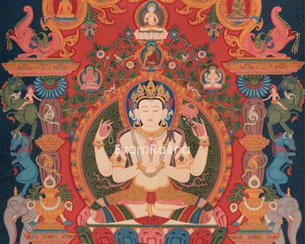 Embark on a journey into the profound compassion of Chenresig with our 'Thousand-Fold Blessings' Thangka Print. This remarkable thangka print beautifully captures the infinite heart of compassion, portraying Chenresig's thousand arms that symbolize universal benevolence. Carefully printed on high-quality canvas, the vivid colors and fine details radiate timeless beauty. Placing this thangka print on your home altar or meditation area, you can kindly invite the transformational energy of compassion into your life and increase the holiness of your holy space. This thangka print is a visual journey into Chenresig's loving heart, offering blessings and spiritual well-being. Let the "Thousand-Fold Blessings" Thangka Print be your treasured travel companion as you pursue enlightenment and inner serenity.