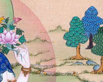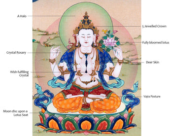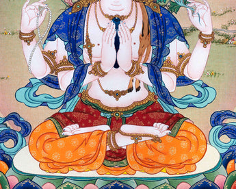 Here's the top-notch thangka digital print of Chenrezig, the highly revered bodhisattva of compassion in Tibetan Buddhism for Chenrezig Meditation. The print expertly captures the deity's serene demeanor, soft smile, and intricately detailed elaborate robes and lotus throne. Tibetan Buddhists highly venerate Chenrezig as a representation of compassion and love and frequently do the Chenrezig meditation to connect with his holy essence and develop compassion within themselves. The Chenrezig meditation is a powerful and transforming technique that aids practitioners in growing compassion and empathy for themselves and others. This poster is a lovely and significant addition to your home or shrine.