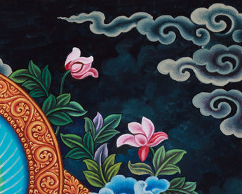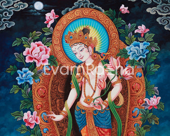 The Standing Chenrezig Thangka Print showcases Avalokiteshvara, the Bodhisattva of Compassion, gracefully poised on a blossoming lotus, symbolizing purity and spiritual enlightenment. His serene demeanor, striking jewels, and flowing garments exhibit his divine compassion and dedication to supporting all beings. Crafted with care through giclée printing methods, this thangka print guarantees remarkable color fidelity and enduring brilliance while preserving the spiritual spirit of the original piece.