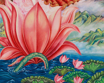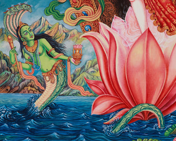 A Naga Kanya, resembling a serpent, pays homage to Chenresig, symbolizing devotion and safeguarding. Revered as protectors of sacred knowledge and the forces of nature, Nagas hold significant importance. The lush floral and mountainous backdrop enhances the feeling of divine harmony, embodying compassion, tranquility, and enlightenment.