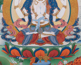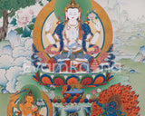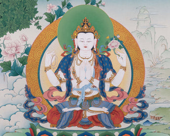 Chenresig, the Bodhisattva of Compassion, is depicted with multiple arms, each holding symbolic objects such as a lotus flower, a crystal rosary, and a wish-fulfilling jewel, radiating compassion to all beings.