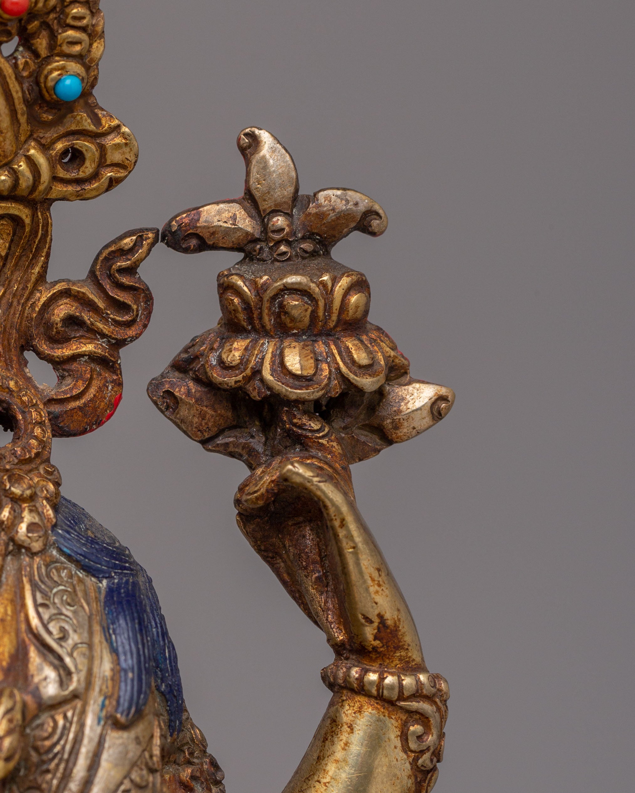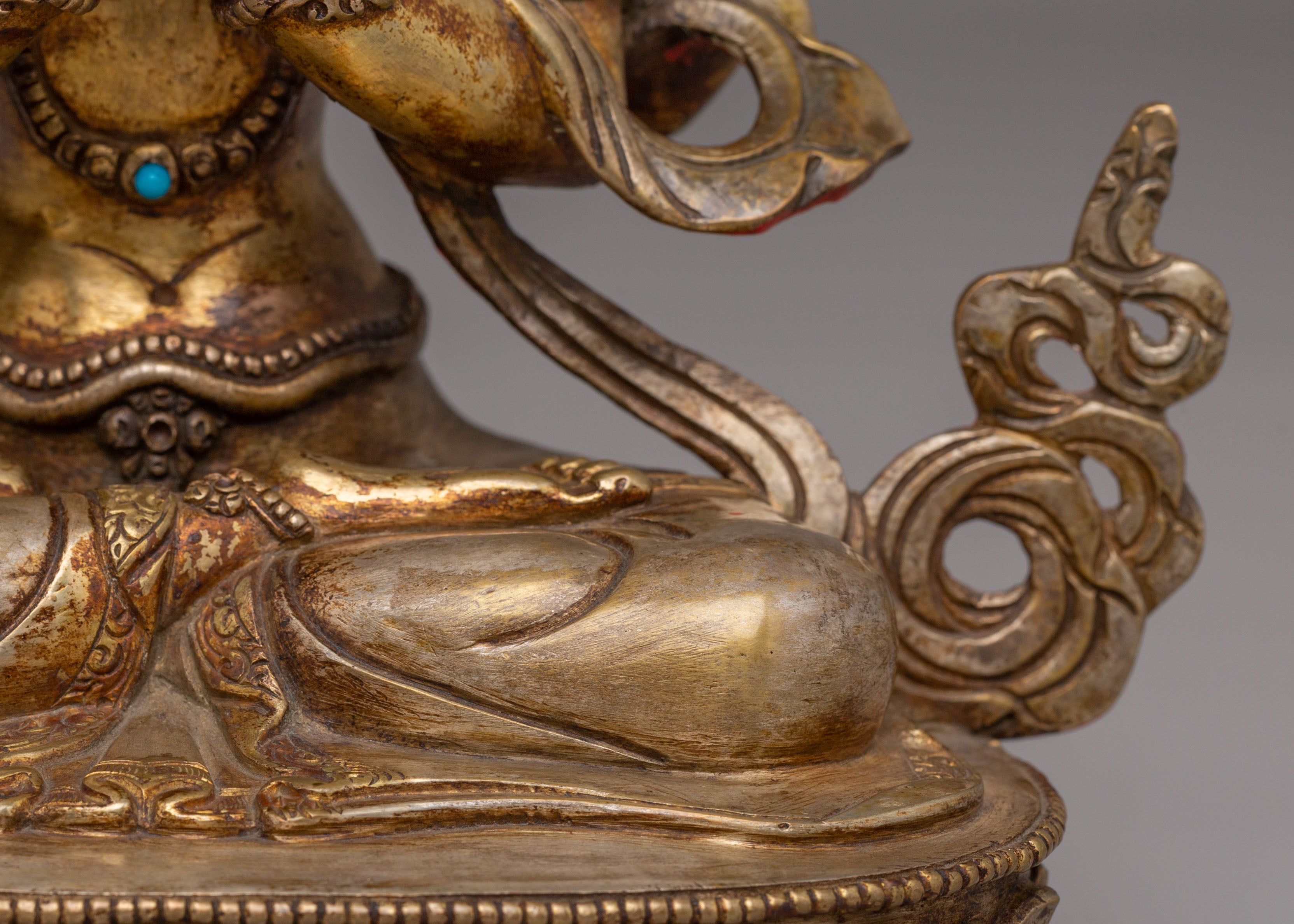 This Chenrezig statue is designed with intricate details, capturing the serene and compassionate expression of the deity. The gold plating brings out the divine nature of Chenrezig, while the silver plating adds depth to the statue’s features. The gemstones embedded in the sculpture enhance its spiritual and aesthetic significance, infusing the piece with both beauty and power. Each hand gesture and delicate detail speaks to Chenrezig's role in alleviating suffering and providing protection to those who seek his blessings.