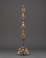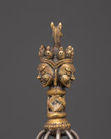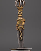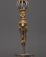 With this Bronze Made Phurba, a revered Tibetan ritual dagger used for energy cleaning, spiritual protection, and ceremonial purposes, you can unleash ancient wisdom and spiritual power. This Phurba, which is 39 cm in height and 10.5 cm in breadth, is made of bronze with an iron core and represents balance, strength, and the ability to dispel negative energy. With a weight of 1.23 kg, it provides a strong, dominating presence that is perfect for ritual use or altar display.