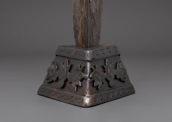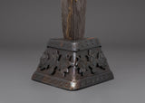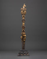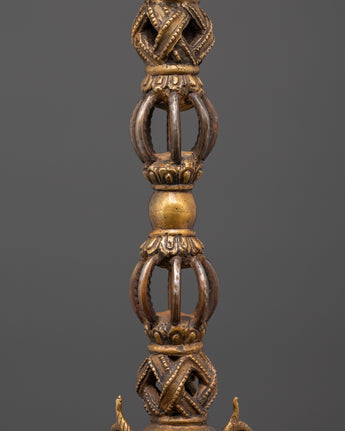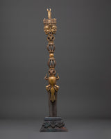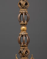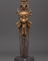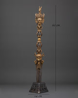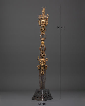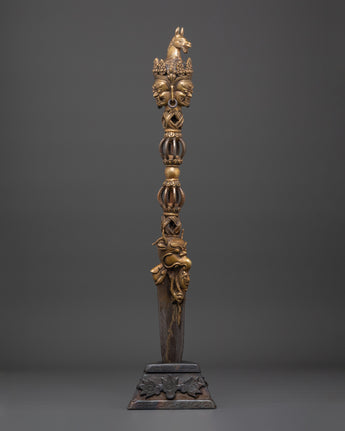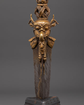 Carefully handcrafted bronze Phurba dagger is a ritual tool expertly made from bronze and iron by skilled Himalayan artisans. With a height of 60 cm and weighing 2.92 kg, its shaft features a dark iron blade complemented by a lustrous bronze upper section, decorated with intricate motifs such as vajra symbols, wrathful deities, and finely detailed faces. These components are not solely ornamental; they bear profound symbolic significance, forged to embody protective and transformative energies. The base and crown are embellished with additional ornate carvings, underscoring their ceremonial significance.