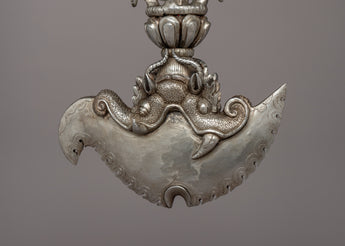 The Buddhist Iron Kartika Knife is an intricately hand-carved artifact with deep spiritual significance in Tibetan Buddhism. Crafted from iron, this sacred blade features a flat, sharpened edge with a curved hook at its outer extremity, symbolizing the ability to cut through ignorance and attachment. The Makara, a mythical sea creature, is prominently displayed with its mouth wide open, appearing to hold the blade, signifying protection and transformation. Atop the handle, a half-vajra is present, symbolizing indestructibility and enlightenment. The combination of these elements makes this Kartika knife a decorative masterpiece and a symbolic representation of spiritual awakening in Buddhist traditions.
