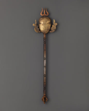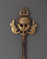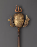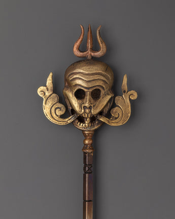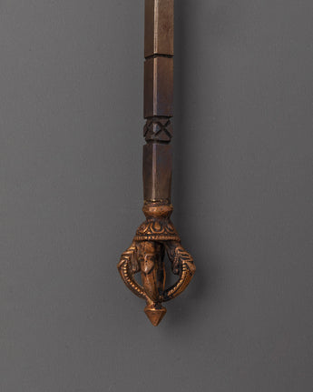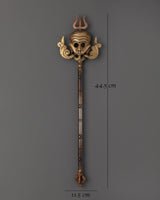 Crafted from iron, brass, and copper, this Buddhist Shrine Khanvanga showcases intricate detailing and traditional Himalayan design, reflecting centuries of masterful craftsmanship. In Tibetan rituals, it serves to stabilize spiritual energy, clear obstacles, and invoke divine blessings, making it an essential tool for deepening meditation and spiritual practices. The symbolic ornaments adorning the Khanvanga—such as vajras, tridents, and skull motifs—represent transformation, protection, and triumph over opposing forces. Adding this sacred staff to your altar or shrine richly enhances your connection to Vajrayana traditions, inviting wisdom, strength, and protective energy into your spiritual space.