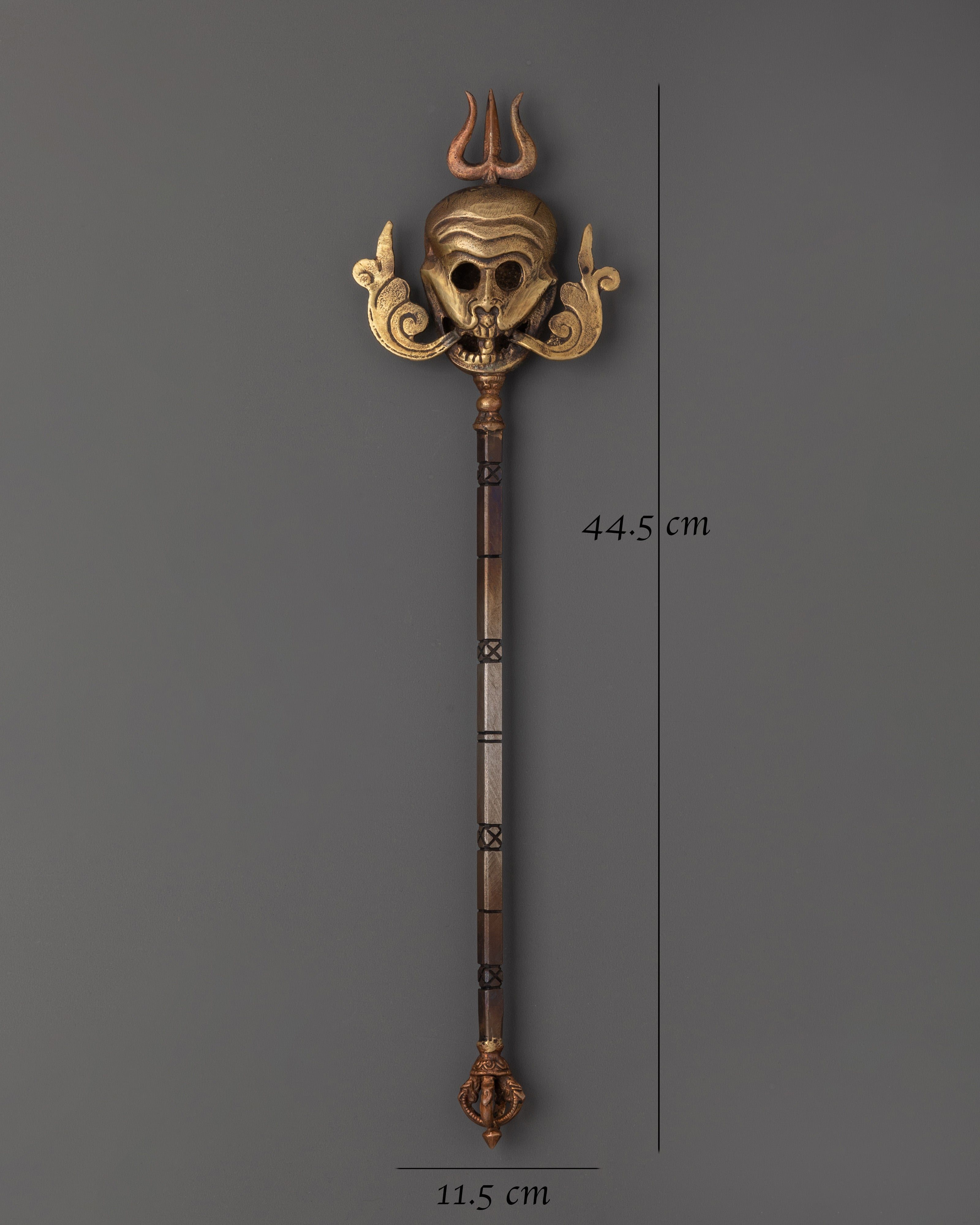 This Buddhist Shrine Khanvanga is a revered tantric ritual staff, rich in symbolism within Vajrayana Buddhism. Traditionally wielded by enlightened deities like Vajrayogini and Guru Rinpoche, the Khanvanga embodies the profound union of wisdom and compassion, serving as a potent emblem of spiritual protection. Measuring 44.5cm tall with an 11.5cm base and weighing 0.35kg, it is expertly crafted to enhance your altar, meditation practice, or Buddhist shrine. Incorporating this sacred staff into your spiritual space invites deepened focus, protection, and connection to timeless Vajrayana traditions, supporting your journey toward enlightenment.