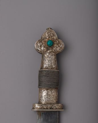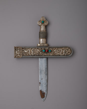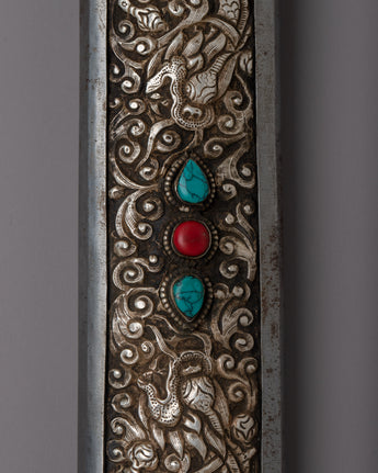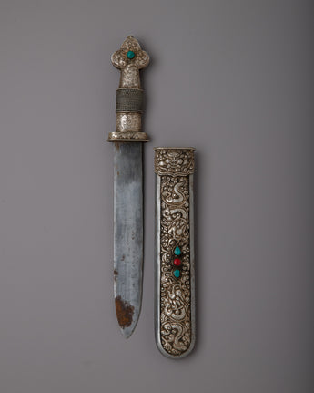 This knife, which stands 32 cm tall and weighs 0.276 kg, is perfect for art supporters, collectors, and spiritual people. The Buddhist Tibet Knife is a beautiful decorative item and a useful utility. Its exquisite design and intricate silver carvings make it a mesmerizing addition to any altar, meditation area, or collection. This knife's spiritual importance and artistic beauty enhance any setting, encouraging thoughtful reflection and reverence. It is a significant artifact that represents the painstaking craftsmanship and profound cultural values of Tibetan culture rather than just a pretty decoration.