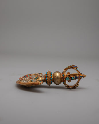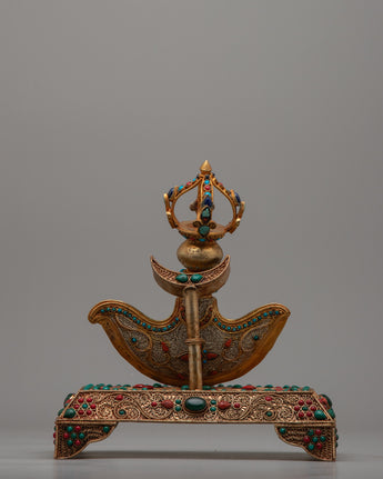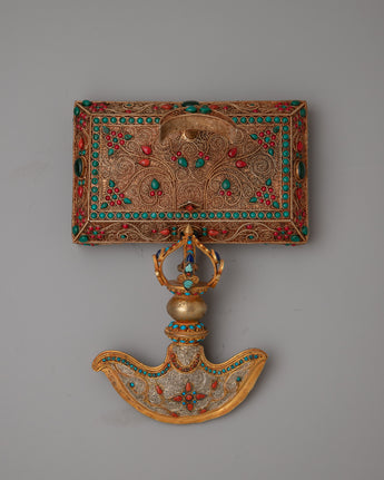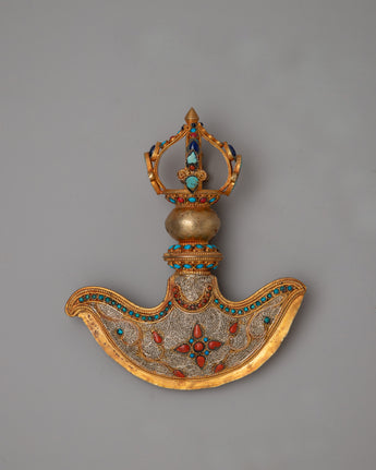 The Kartika Knife becomes a harmonic blend of earthly components and divine symbols when inlaid with original and artificial stones like coral, turquoise, and lapis lazuli. The spiritual characteristics of these stones add to the knife's ceremonial importance, bestowing it protection, knowledge, and compassion. The Copper Kartika Knife is a highly esteemed tool in Buddhist ceremonies and rituals. It is a potent symbol that may cut through ignorance and illusion and direct practitioners on the path to enlightenment.
