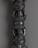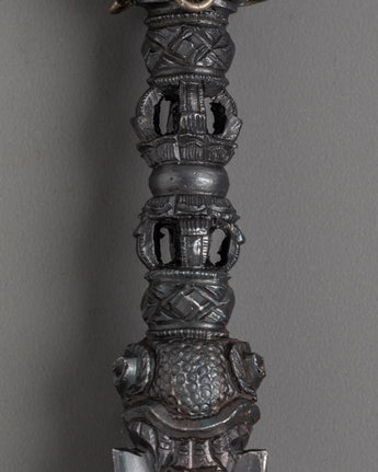 The ceremonial dagger (Sanskrit: Kila; Tibetan: phurba) is essential for expelling evil and is considered particularly effective in neutralizing the forces obstructing Tantric Buddhist practice. It has ancient origins, first appearing in the Indian Rig Veda as the core blade of the vajra used by Indra to destroy the primordial cosmic snake Vritra. Kila, derived from Sanskrit, was most likely associated with Vedic sacrifices. Meditation on the Vajrakila Tantra, an early Indian scripture first promoted in Tibet in the eighth century by Padmasambhava, one of the founding teachers of Tibetan Buddhism, is used to invoke the three-headed Vajrakila Buddha.