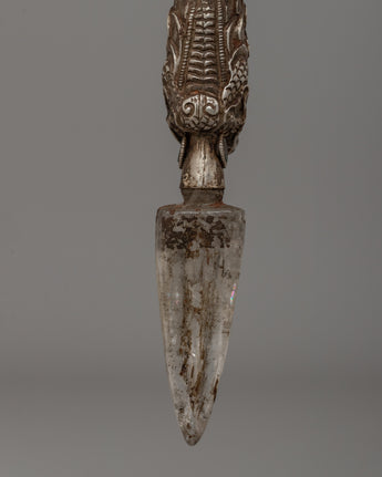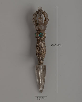 This Phurba is ideal for practitioners and collectors, as it skillfully combines spiritual significance with artistic workmanship. The silver plating and turquoise inlay enhance its heavenly nature, while its elaborate design and crystal body represent purity and clarity. With its everlasting aura of protection, balance, and consciousness, this Phurba can be utilized as a beautiful centerpiece or in rituals.