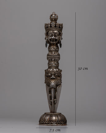 The powerful ceremonial tool and eye-catching decorative item, the Dorje Phurba Dagger, is perfect for collectors, spiritual seekers, and art lovers. Its profound spiritual significance and handmade beauty enhance any space, as its presence demands attention and thoughtful reflection. This dagger is a treasured addition to any collection or hallowed area since it is more than just a pretty piece of art. It is a significant relic that represents fine craftsmanship and profound spiritual principles.