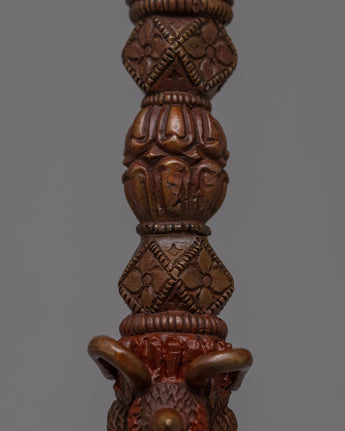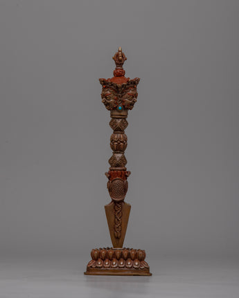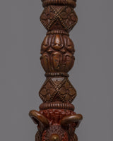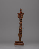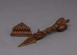Respected in Tibetan Buddhism, the Dorje Phurba Vajrakilaya Dagger is a great spiritual force that has the potential to eliminate negative energies and obstructions. Perfect for collectors, spiritualists, and art lovers, this phurba is a powerful ceremonial instrument as well as an eye-catching ornament. Its presence inspires thoughtful reflection and reverence, and its exquisite craftsmanship and spiritual significance enhance any interior. This phurba with stand is a treasured addition to any collection or sacred space since it is more than just a pretty object; it is a significant artifact representing profound spiritual values and artisanal skills.