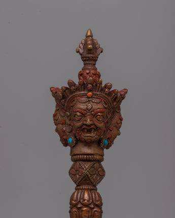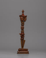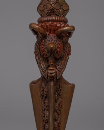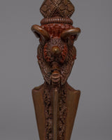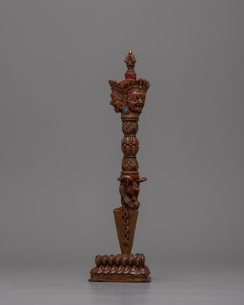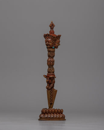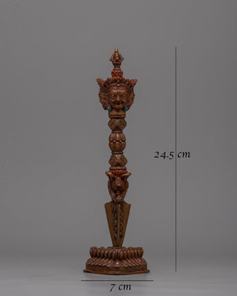 Presenting the Dorje Phurba Vajrakilaya is an incredible example of traditional craftsmanship and spiritual artistry. This phurba with stand weighs 0.592 kg and is crafted by hand from oxidized copper. Its dimensions are 24.5 cm in height and 7 cm in breadth. The oxidized finish enhances its deep symbolic significance and traditional appearance, which has a sense of antiquity.