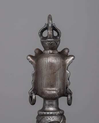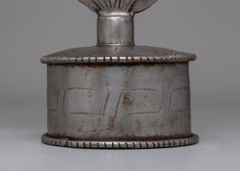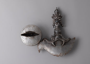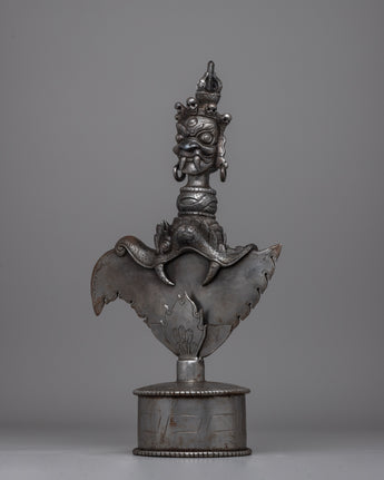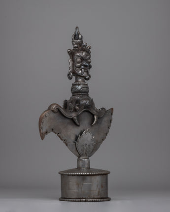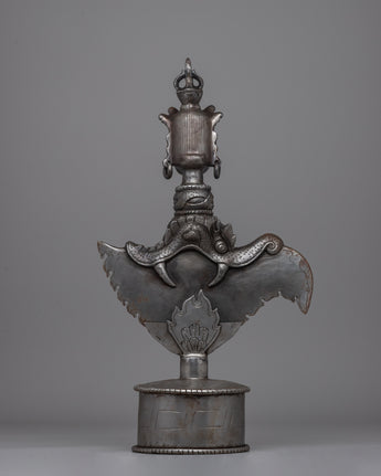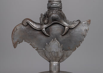 The crescent-shaped blade and wrathful god handle of the Kartika symbolize the transformational power of Buddhist teachings, supporting devotees in rituals aimed at minimizing the ego and reaching spiritual clarity. It is an important tool in tantric ceremonies, sometimes used in conjunction with a vajra to represent the combination of wisdom and compassion. Its elaborate craftsmanship and profound symbolic value make it an excellent addition to altars, sacred settings, or collections reflecting Buddhist tradition.